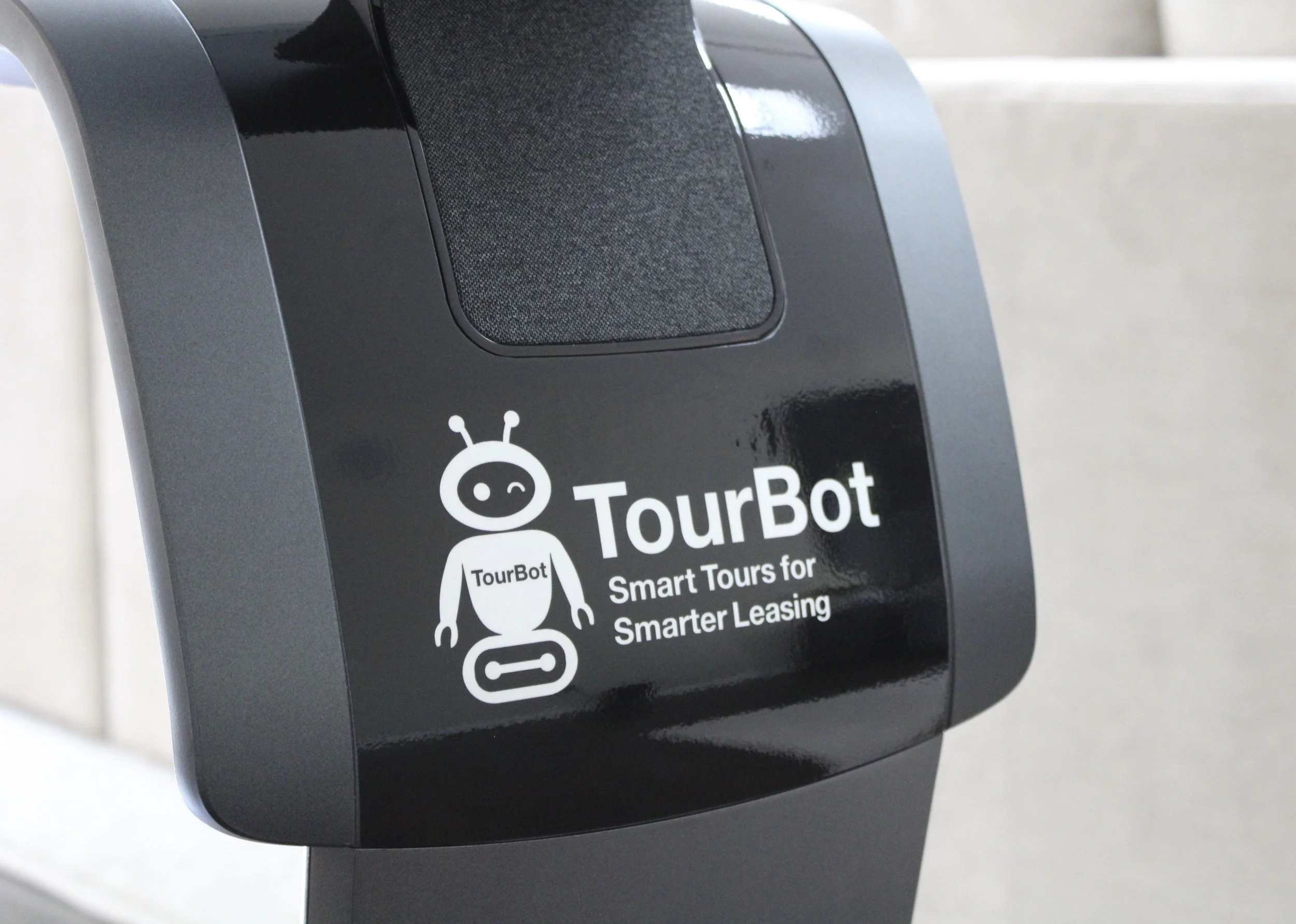Close-up of TourBot logo and text on a black surface, featuring a robot icon with antennas, and slogan 'Smart Tours for Smarter Leasing.'
